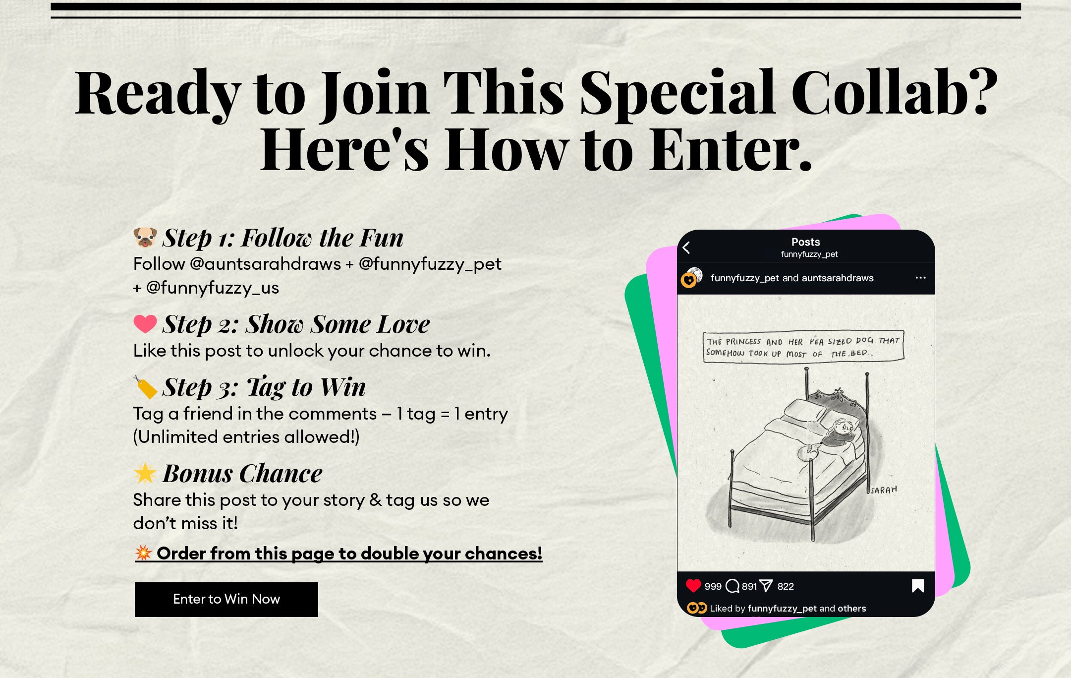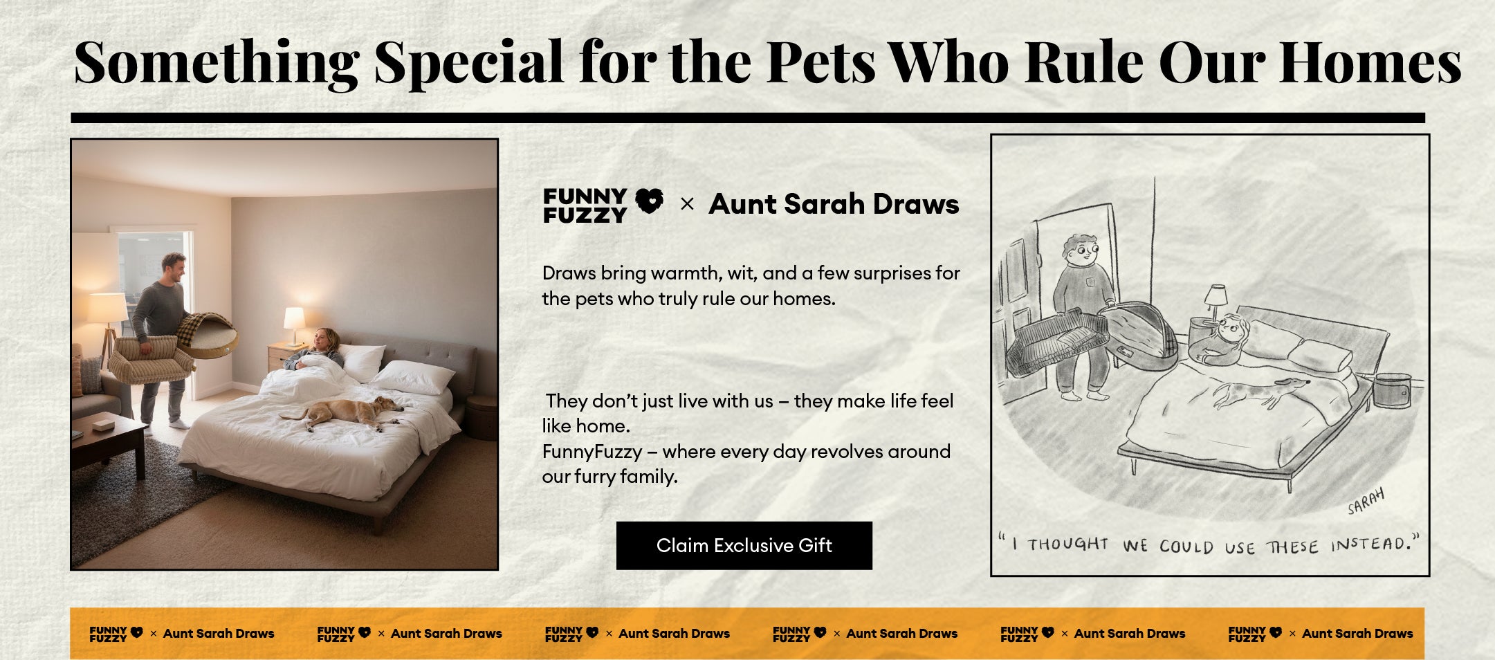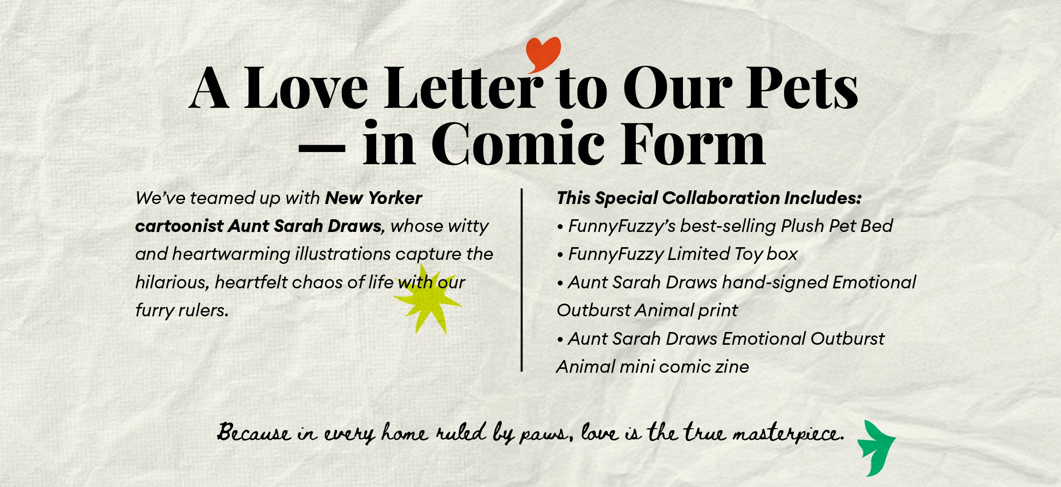 Use code SARAHFF30 to celebrate our heartfelt collab with Aunt Sarah Draws, the New Yorker cartoonist who turns everyday pet chaos into pure joy.